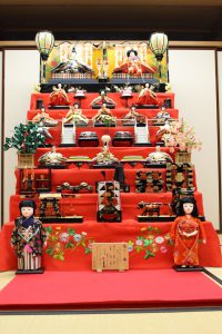 1階「おえの間」で、七段飾りの雛人形を展示しています。